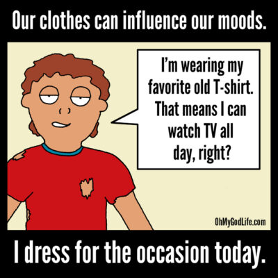 How do I want to feel today? Focused and energized? Relaxed and chill? There’s a simple way to accentuate these states, and that’s with my clothing. My clothes are one of the myriad ways Spirit expresses itself. When I combine my desired state with clothing to match, I am strengthening and blessing my intention. Whether watching TV in my sweats or working in my power suit, I am aligned!