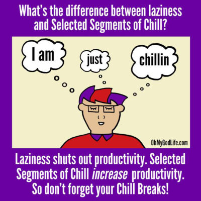 I can’t be productive all the time. Productivity is born from inspiration and energy, and those require balance. So in order to stay productive, I need to cultivate balance in my life. This includes rest. This includes daydreaming. This includes time to do nothing at all. These periods of chill allow me to charge back into my projects, revived and refreshed. Everyone benefits when I allow the Chill.
