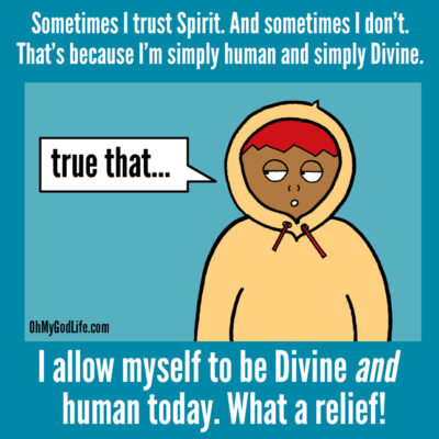 When I think I have to be super spiritual in every moment, it can paradoxically knock me out of alignment with Spirit. The truth is that I am both human and Divine. As I acknowledge this truth, I bring love and compassion to my human self. Do I still think petty and contracted thoughts? Sure. Do these thoughts define me? No way! Can I love myself in my Divinity and my humanness? Yes!