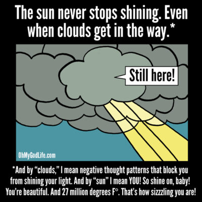 My light is always shining. Even when the clouds of doubt and disbelief obscure my ability to see it. When I’m feeling a little cloudy, it’s time to bust out the sun catchers. What can I do to remind myself of how wonderful I am? Call a friend? Spend time in nature? Meditate? Today I do those things, even if I’m not feeling cloudy. After all, it’s always a good time to see and acknowledge my light.