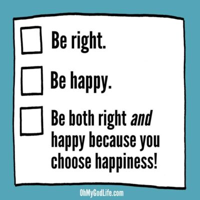 I can always choose happiness. It may feel too late. I may feel so stuck in proving myself right that I seem trapped in a pattern of stubborn contentiousness. But I’m never stuck. I can always choose again. Today I look for where I may be caught in patterns of needing to prove myself right. Can I relax those patterns a bit? Can I choose peace and harmony instead? (Hint hint: The answer is Yes!)