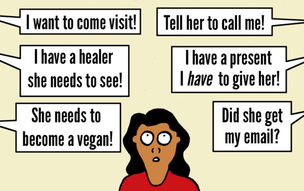 My wife of many years is in the end stages of cancer. Although it is hard, both of us are accepting the process and it is actually beautiful in some ways. The hard part is with our friends and acquaintances. We are part of a large spiritual community and everyone wants to either help out in some way or spend time with my wife. She’s not up for seeing many people, and I’m having a hard time navigating and negotiating other people’s demands. Or what feels to me like demands! It doesn’t help that I’m a bit (my wife would say more than a bit) of a people pleaser. Do you have any thoughts on this?