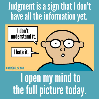 When I judge, I create a dividing line between me and the thing I’m judging. But my spiritual practice shows me there’s no dividing line. I am one with all of creation, including the thing I’m judging. Hmmm. Today I examine my objects of judgment. How are we alike? How am I judging those parts of myself that I see in what I judge? Today I bring love to all of it – me, the judge, and the judgee.