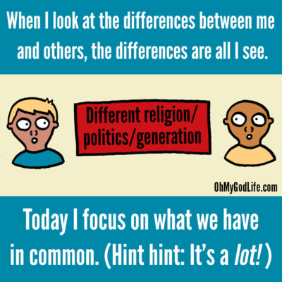 Differences between myself and others can become blown out of proportion in my mind. The differences are all I can see. Today I fix my sight and bring things back into perspective. If there’s someone I’m convinced is nothing like me, I make a list of all the things we have in common. As I contemplate this list of similarities, I find something magical dwelling among our many connections: Love.