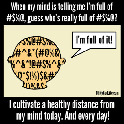 Just because I think something doesn’t mean I have to believe it! This realization can change my life. As I become more discerning about the thoughts in my head, I cultivate a healthy distance from them. This distance allows me to choose: Do I want to keep this thought? Or do I want to toss it? Hint hint: Thoughts that make me feel like @#%&?? Those can go!!